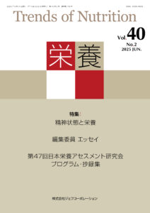 Vol.40 No.2 特集:精神状態と栄養 本を読む ダウンロード購入 目次 精神状態と栄養 【総説】うつ病患者と栄養 功刀 浩 【総説】肥満症の食行動と不安・抑うつとの関連 端 こず恵、會田友里佳、林 果林 【総説】抑うつ・心理的ストレスと食品摂取頻度との関連 後藤知子、佐藤ゆき 【総説】 食・栄養のメンタルヘルスへの影響 Impact of Food and Nutrition on Mental Health 松岡のはら、松岡 豊 編集委員 エッセイ 自身の栄養研究を振り返って 濵田康弘 私の栄養に関する研究を振り返って 和佐勝史 投稿規定